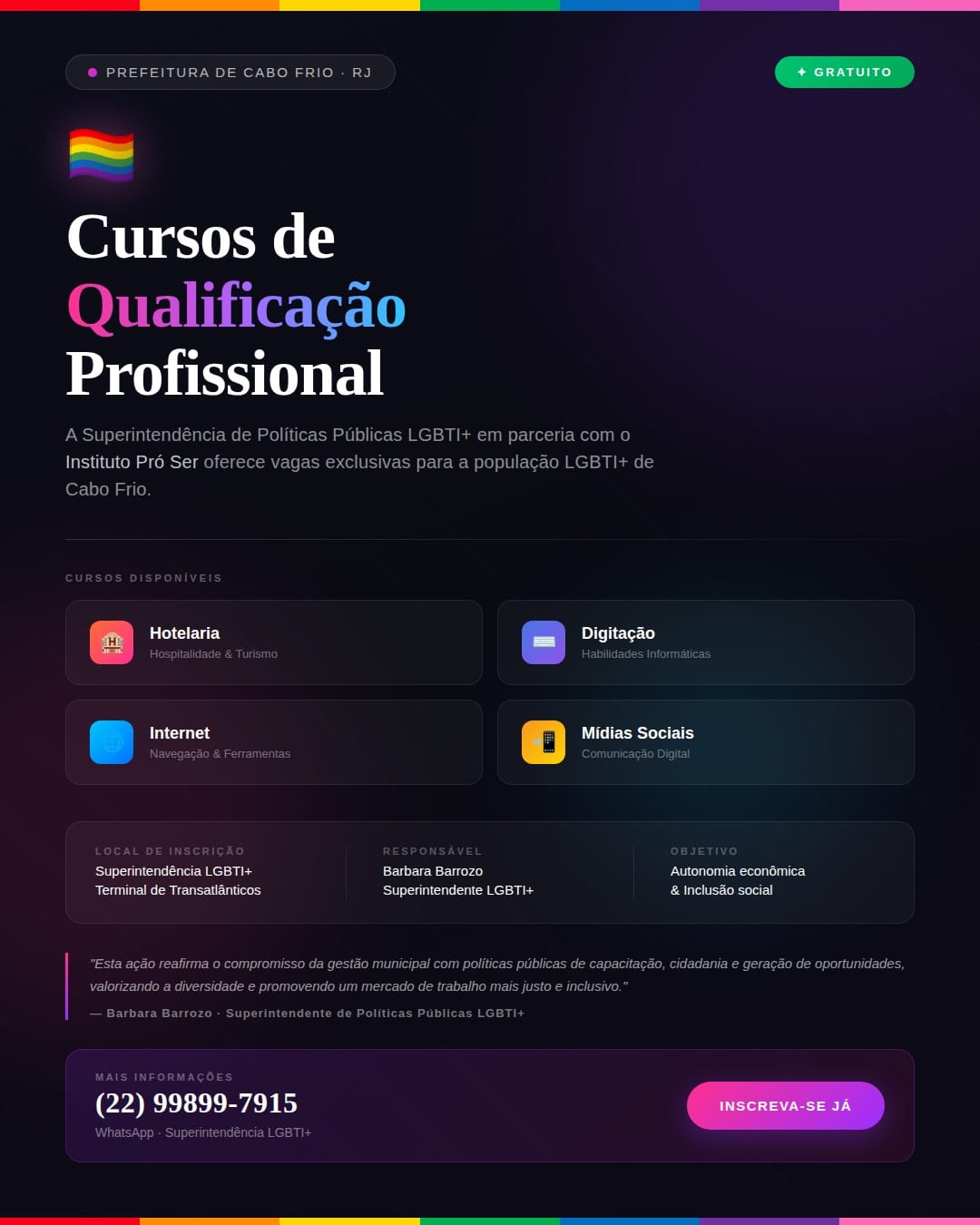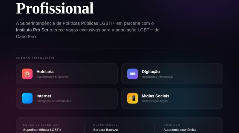 A Cabo Frio, por meio da Superintendência de Políticas Públicas LGBTI+ de Cabo Frio, em parceria com o Instituto Pró Ser, está com inscrições abertas para cursos gratuitos de qualificação profissional destinados à população LGBTI+ do município.