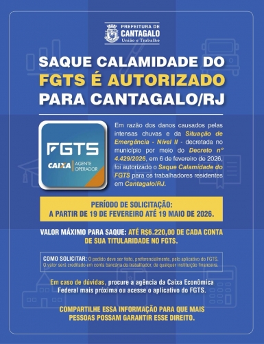 Já está em andamento o calendário de saques do Fundo de Garantia do Tempo de Serviço (FGTS) por calamidade para trabalhadores de Cantagalo afetados pelas fortes chuvas que atingiram o município no início do mês. As solicitações podem ser feitas até o dia 19 de maio de 2026.