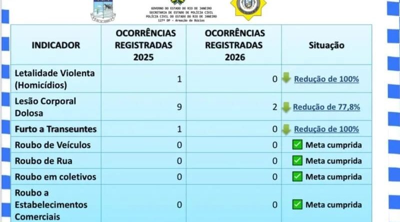 O Carnaval 2026 em Armação dos Búzios foi marcado por redução significativa nos índices de criminalidade, segundo dados divulgados pelo Instituto de Segurança Pública (ISP), órgão vinculado ao Governo do Estado do Rio de Janeiro.