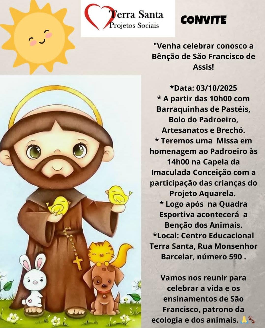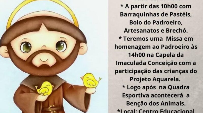 O Centro Educacional Terra Santa promove nesta sexta-feira a tradicional bênção dos animais, em celebração a São Francisco de Assis, padroeiro da natureza e dos animais. A programação começa às 10h, com barracas de pastéis, artesanato, brechó e o tradicional bolo do padroeiro, reunindo famílias e amigos em um ambiente de convivência comunitária.