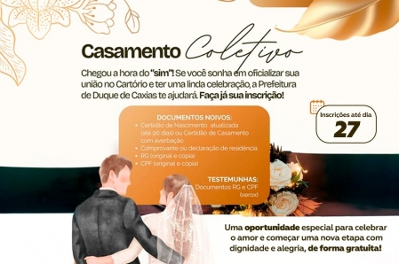 A Secretaria Municipal de Gestão e Inclusão de Duque de Caxias está com inscrições abertas até o dia 27 de fevereiro para o Casamento Coletivo, iniciativa que vai oficializar gratuitamente a união civil de casais do município, com prioridade para aqueles em situação de vulnerabilidade social.