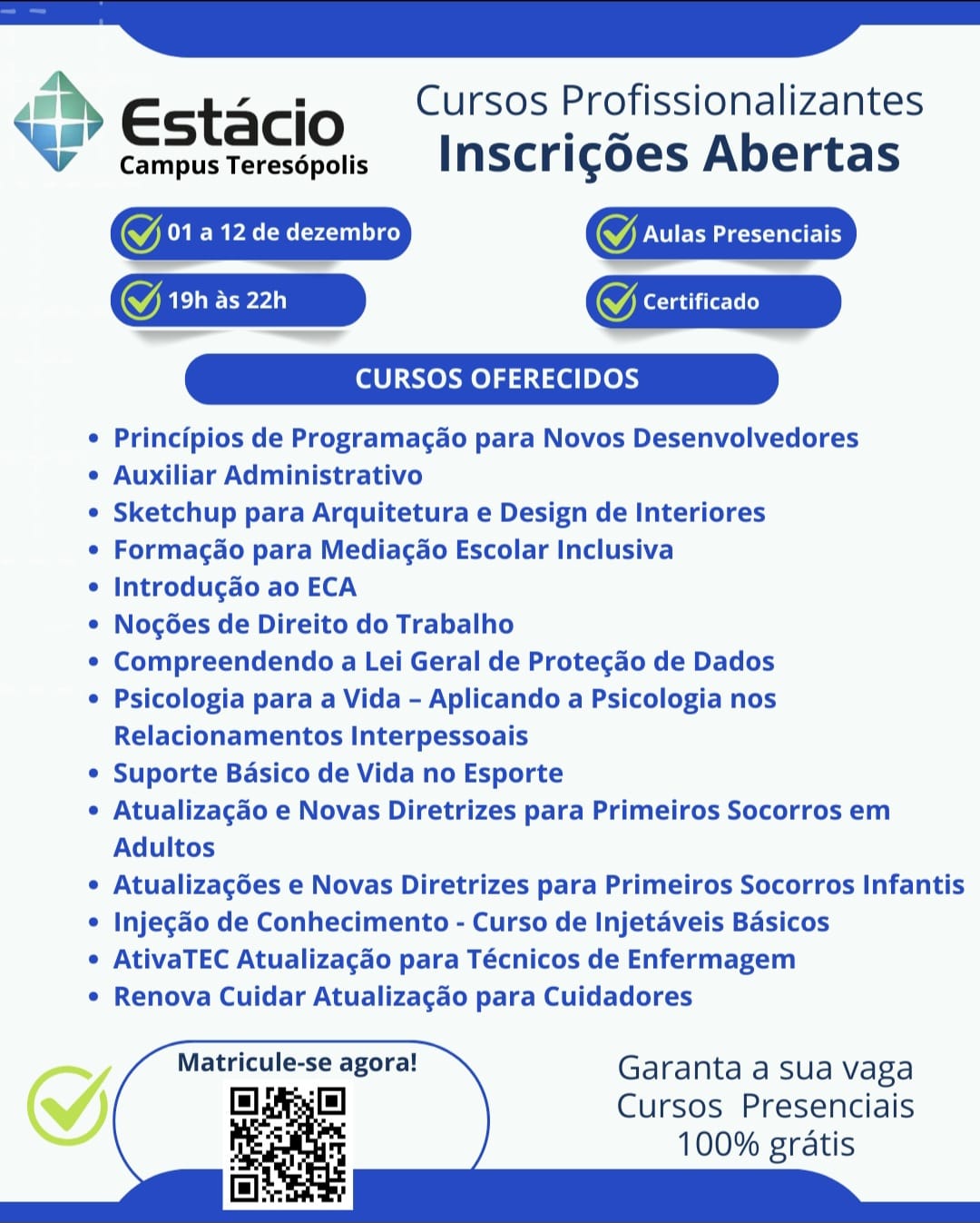 A Estácio Teresópolis está com inscrições abertas para a nova edição do Projeto Avança+, que oferece cursos profissionalizantes gratuitos e presenciais voltados à qualificação de moradores da região. As aulas serão realizadas entre os dias 1º e 12 de dezembro, das 19h às 21h40, no campus da instituição, e os participantes receberão certificado de conclusão ao final das atividades. As vagas são limitadas.