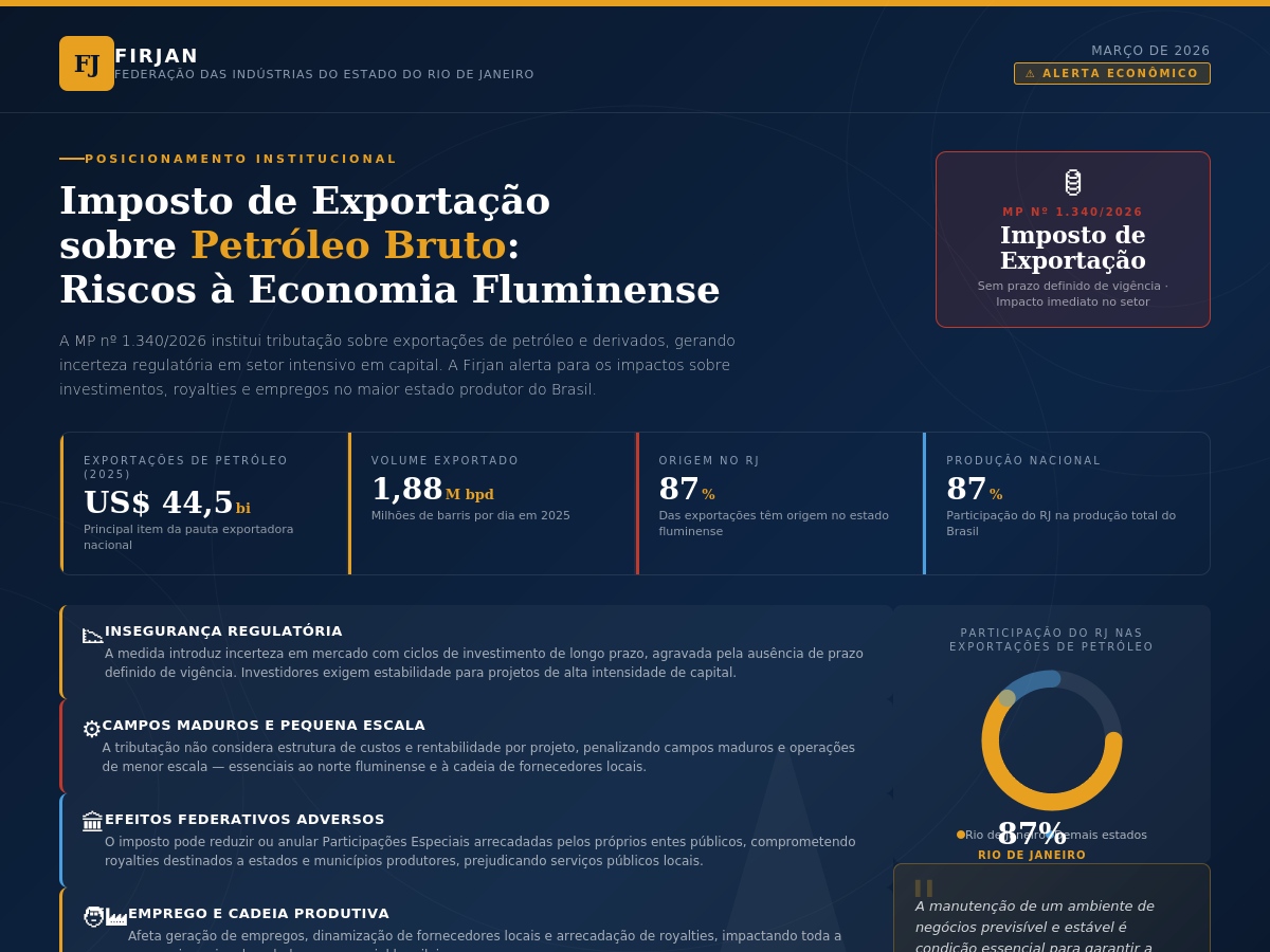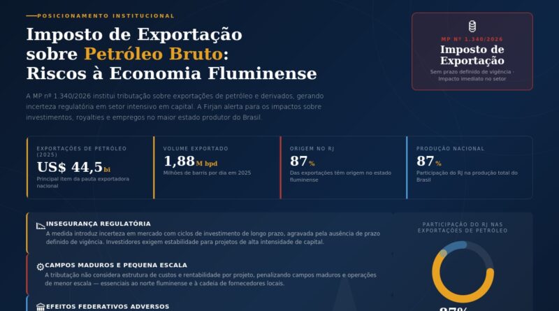 A Federação das Indústrias do Estado do Rio de Janeiro manifestou preocupação com a adoção do Imposto de Exportação (IE) sobre petróleo bruto e derivados, instituído pela Medida Provisória nº 1.340/2026. A entidade reconhece a necessidade de medidas emergenciais diante da instabilidade econômica provocada por conflitos em regiões estratégicas do mercado energético global, mas alerta para os impactos da nova tributação sobre a economia e o ambiente de negócios.