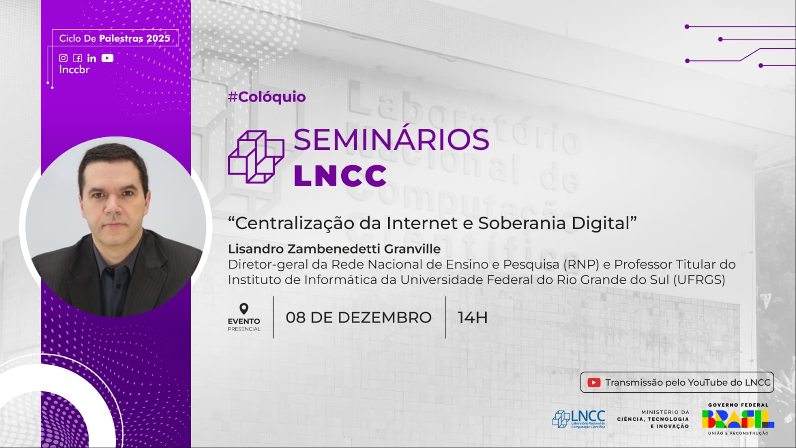 O Programa de Pós-Graduação do Laboratório Nacional de Computação Científica (LNCC) realiza no dia 8 de dezembro, às 14h, mais uma edição de sua série de colóquios. A palestra terá como tema “Centralização da Internet e Soberania Digital” e será conduzida por Lisandro Zambenedetti Granville, diretor-geral da Rede Nacional de Ensino e Pesquisa (RNP) e professor titular do Instituto de Informática da Universidade Federal do Rio Grande do Sul (UFRGS). O encontro será no Auditório B do LNCC, com participação gratuita e aberta ao público, além de transmissão ao vivo pelo canal da instituição no YouTube.