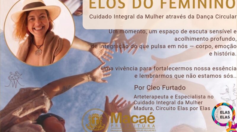 Com o tema “Elo do feminino: Cuidado Integral da Mulher através da Dança Circular”, a programação propõe uma vivência voltada ao fortalecimento do autocuidado, da escuta sensível e do sentimento de pertencimento. A condução será da arteterapeuta Cleo Furtado, especialista em cuidado integral da mulher madura.