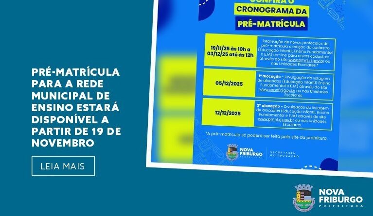 A Secretaria Municipal de Educação (Seduc) de Nova Friburgo publicou, no último dia 7 de junho, a Portaria que regulamenta a pré-matrícula para o ano letivo de 2026 na Rede Municipal de Ensino. Conforme o Diário Oficial Eletrônico do Município (edição nº 2.432), o cadastro será realizado exclusivamente pela internet, no site www.novafriburgo.rj.gov.br, entre os dias 19 de novembro e 3 de dezembro de 2025. O processo abrange a Educação Infantil (Creche e Pré-escola) e o Ensino Fundamental (Regular e EJA), com a relação completa de documentos obrigatórios disponível na portaria.