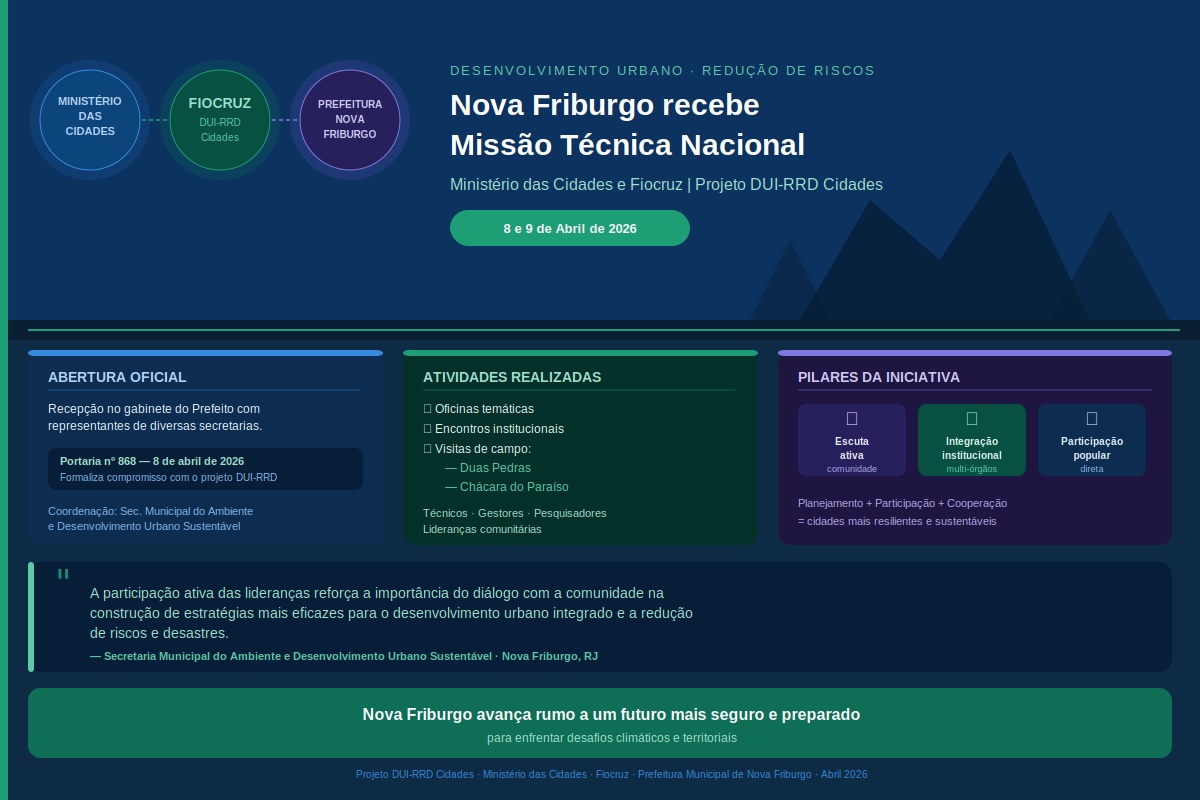 O município de Nova Friburgo sediou recentemente uma visita técnica promovida pelo Ministério das Cidades e pela Fundação Oswaldo Cruz, por meio do projeto DUI-RRD Cidades. A iniciativa foi coordenada pela Secretaria Municipal do Ambiente e Desenvolvimento Urbano Sustentável.