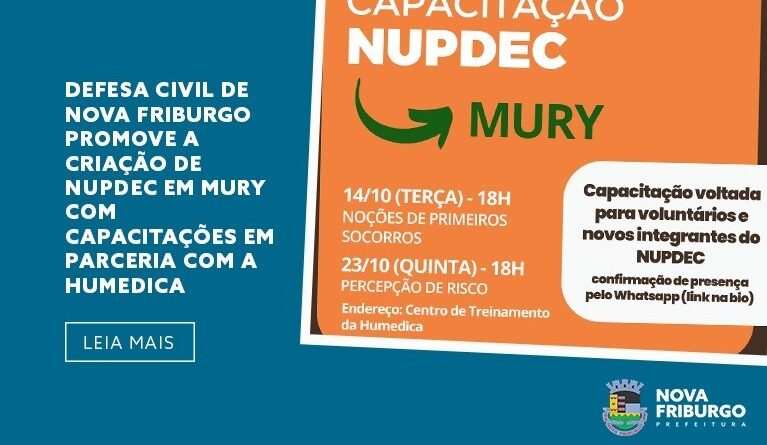 A Secretaria de Proteção e Defesa Civil de Nova Friburgo, em parceria com a organização humanitária Humedica Brasil, iniciou neste mês a implantação do Núcleo Comunitário de Proteção e Defesa Civil (NUPDEC) no distrito de Mury. A iniciativa busca capacitar moradores para atuar em situações de emergência e desastres, promovendo a cultura da prevenção e da resiliência na comunidade.