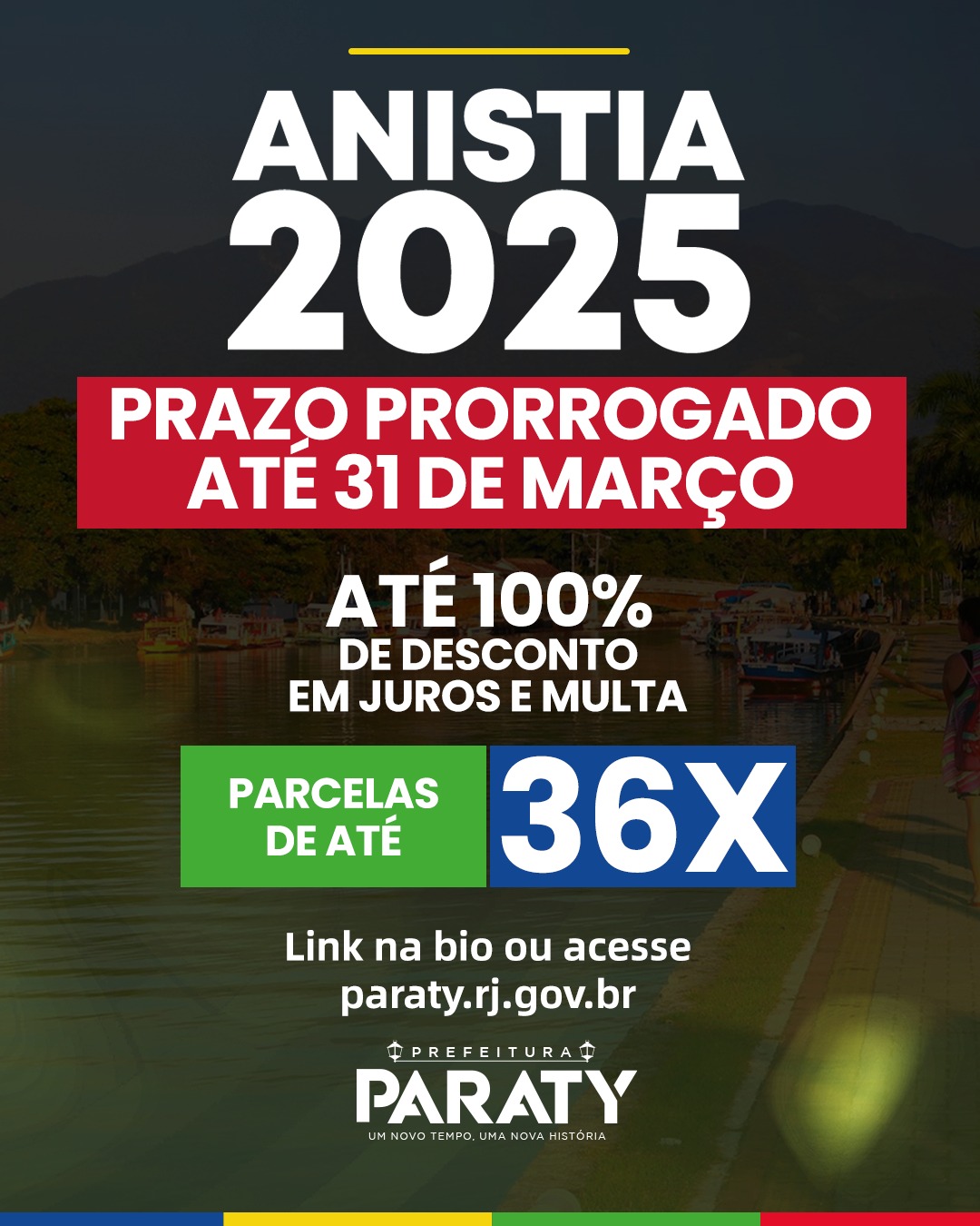 Paraty anunciou a prorrogação do Programa de Anistia 2025, que agora seguirá vigente até 31 de março deste ano. A iniciativa oferece aos contribuintes a oportunidade de regularizar débitos em aberto com o município, com descontos de até 100% em juros e multas. As condições de pagamento permanecem as mesmas: à vista ou parcelamento em até 36 vezes, facilitando a quitação de pendências de forma acessível e organizada.
