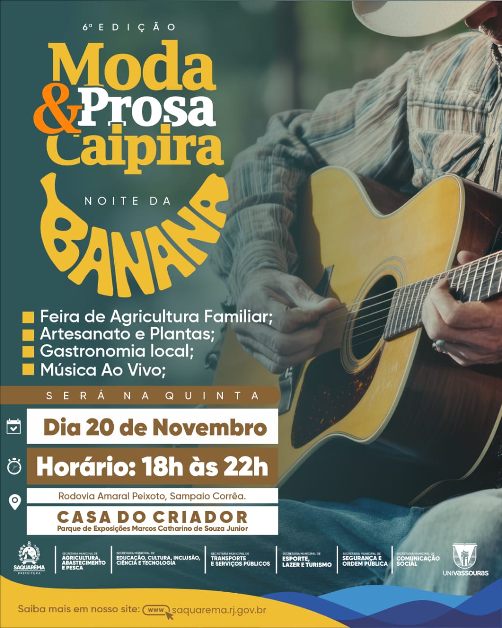 A Secretaria Municipal de Agricultura, Abastecimento e Pesca de Saquarema realiza, no dia 20 de novembro, a 6ª edição do Moda e Prosa Caipira – Noite da Banana, a partir das 18h, no Parque de Exposições Marcos Catharino, em Sampaio Corrêa. O evento tem como objetivo valorizar a cultura rural e fortalecer a agricultura familiar do município, com uma edição especial dedicada à banana, fruto símbolo da região e protagonista de diversas receitas tradicionais. O público poderá saborear pratos típicos e vivenciar uma experiência gastronômica que celebra a identidade local.