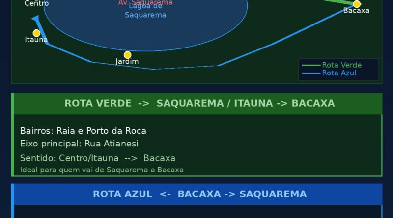 A chamada Rota Verde, no sentido Saquarema (incluindo Itaúna) para Bacaxá, atravessa os bairros Raia e Porto da Roça, tendo a Rua Atianesi como principal eixo de ligação. Já a Rota Azul funciona no sentido inverso, de Bacaxá para Saquarema, passando pelo bairro Jardim e contornando o entorno da Lagoa de Saquarema.