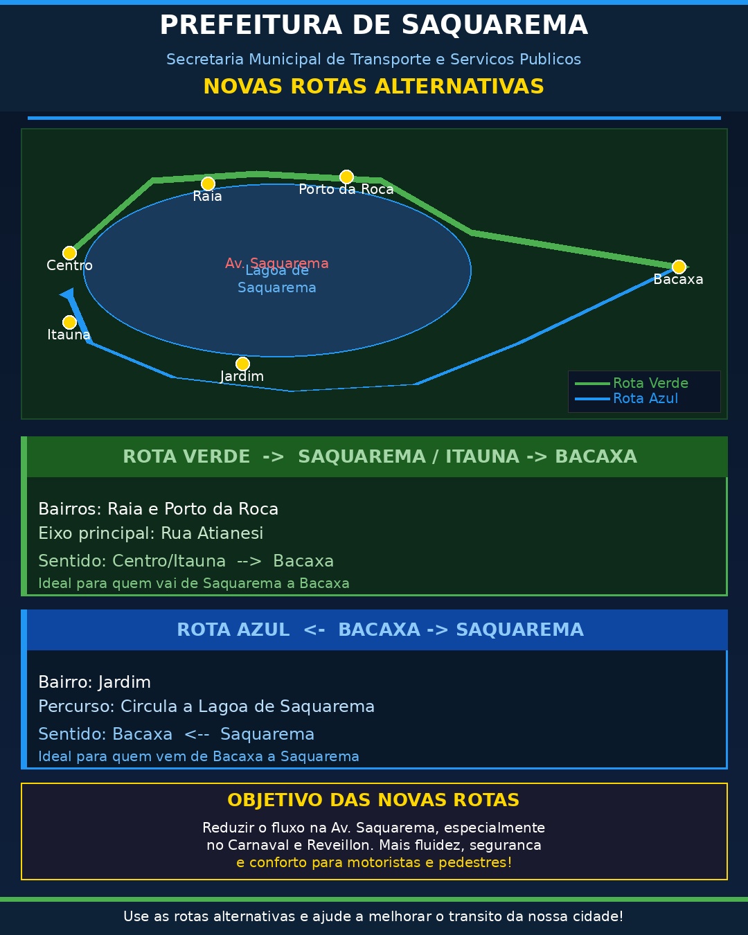 A Prefeitura de Saquarema, por meio da Secretaria Municipal de Transporte e Serviços Públicos, implantou duas rotas alternativas à Avenida Saquarema com o objetivo de facilitar o deslocamento entre o Centro da cidade e o distrito de Bacaxá.