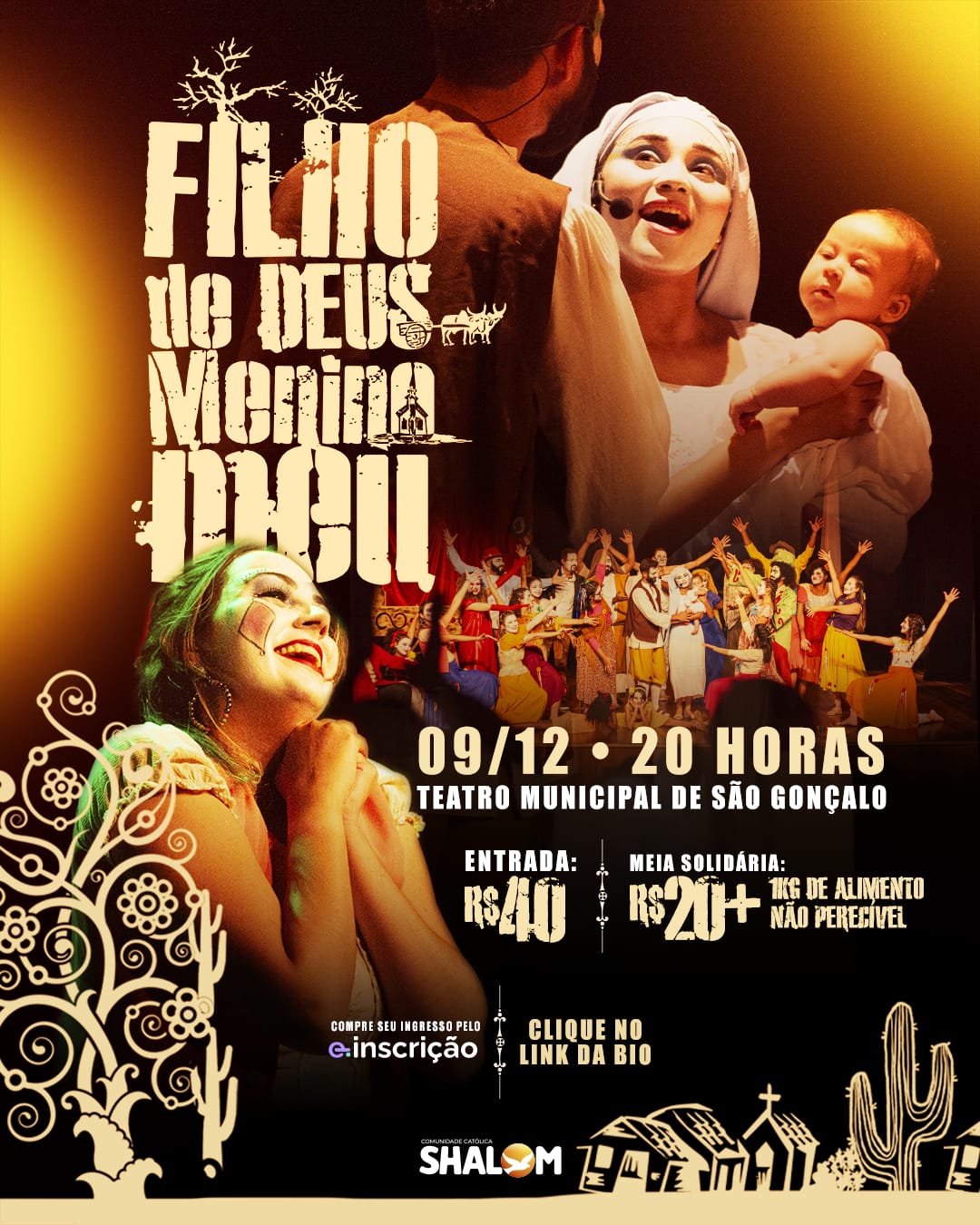 A Secretaria de Turismo e Cultura de São Gonçalo segue fortalecendo a cena artística da cidade com uma programação intensa no Teatro Municipal George Savalla Gomes. Nesta terça-feira (9), às 20h, o espaço recebe o musical natalino “Filho de Deus, Menino Meu”, apresentado pela Trupe da Encarnação. Com linguagem inspirada no teatro mambembe e uma combinação de música — do tango ao pop —, dança e elementos circenses, o espetáculo celebra o nascimento de Jesus com leveza, humor e sensibilidade. A classificação é livre, e os ingressos estão disponíveis no site da produção.