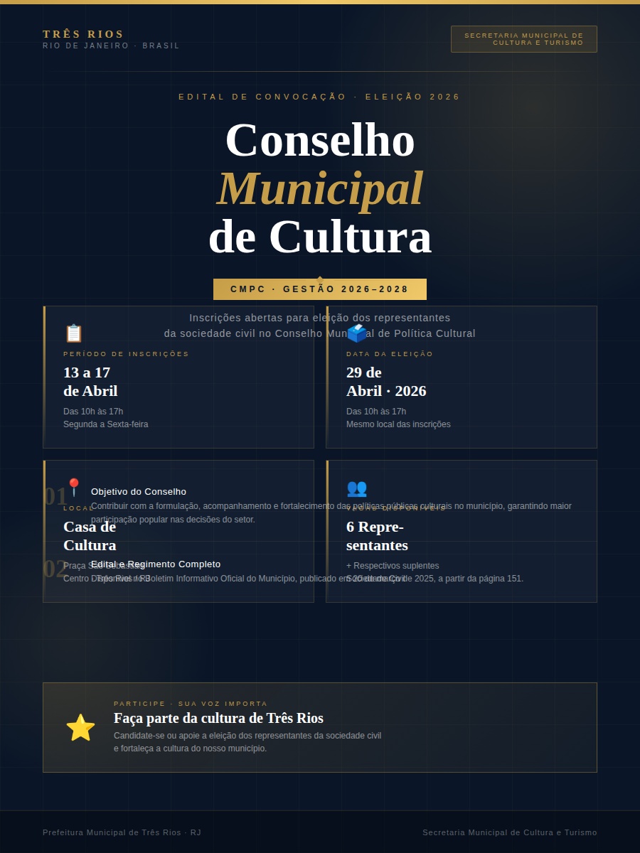 O município de Três Rios inicia, na próxima segunda-feira, o período de inscrições para a eleição dos representantes da sociedade civil no Conselho Municipal de Política Cultural (CMPC), referente ao biênio 2026/2028. Os interessados poderão se inscrever de segunda a sexta-feira, das 10h às 17h, na sede da Secretaria Municipal de Cultura e Turismo, localizada na Casa de Cultura, na Praça São Sebastião, no Centro.