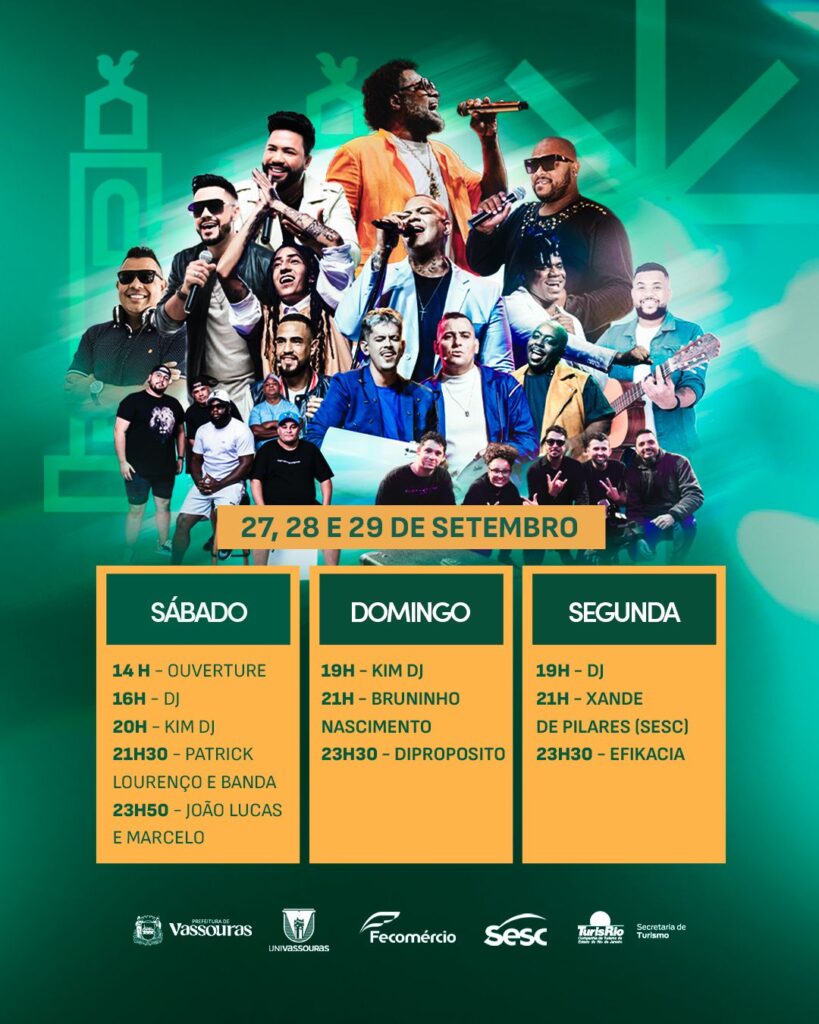A cidade de Vassouras se prepara para comemorar em grande estilo seus 168 anos de história. De sábado a segunda-feira, o Campo de Futebol ao lado do Corpo de Bombeiros será palco de uma programação especial, com shows gratuitos que prometem atrair moradores e visitantes. Entre as atrações confirmadas estão Xande de Pilares, o grupo DiPropósito e a dupla João Lucas & Marcelo, além de DJs e talentos locais.